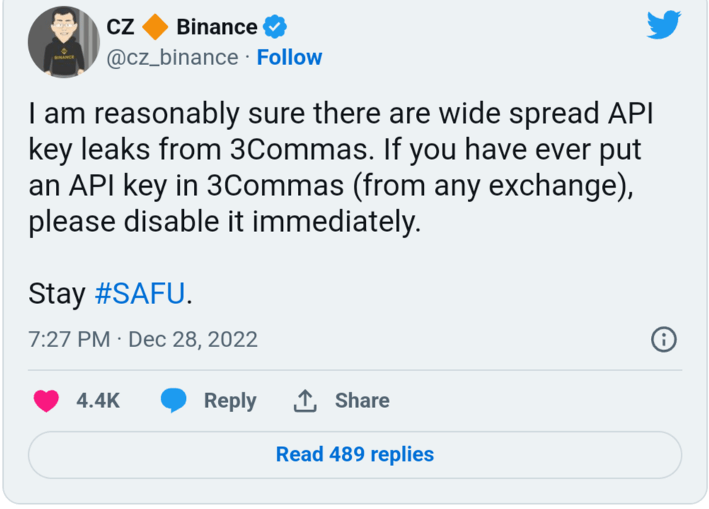 “Acredito firmemente que @tier10k está correto aqui”, escreveu CZ no Twitter, referindo-se a uma postagem de um usuário que disse que um vazamento de API foi publicado na internet. “Se você já colocou uma chave de API no 3Commas (de qualquer corretora), desative-a imediatamente.”